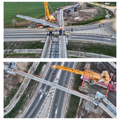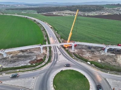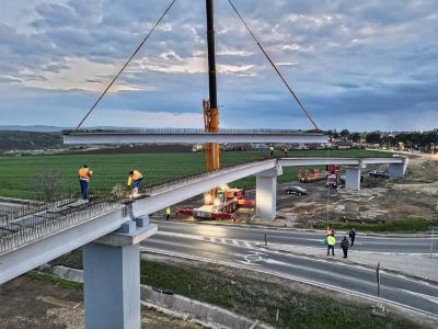 Sâmbătă spre duminică, au fost montate ultimele două grinzi ale pasarelei pentru bicicliști peste șoseaua de centură (DN 28D), în zona sensului giratoriu de la Valea Ursului.